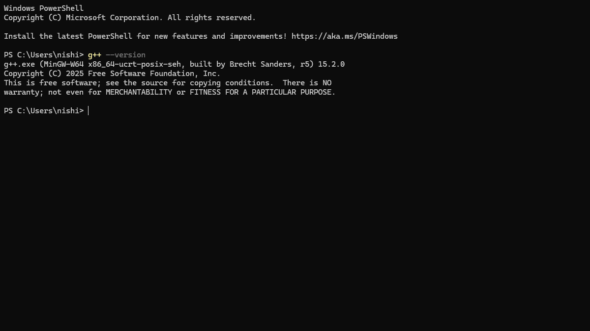 実際に、PowerShellを開いて g++ が使えるか確認する。下記のコマンドでバージョンを確認する。