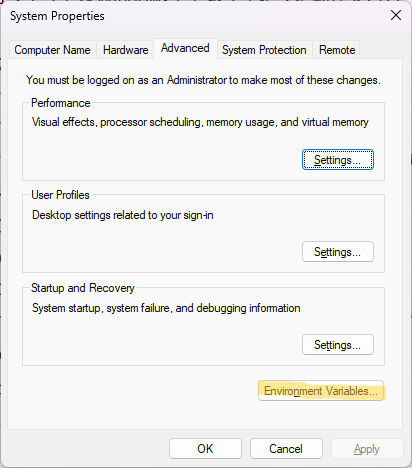 Cドライブ直下に置いた、mingw64フォルダのbinフォルダを環境パスに設定する。Windowの検索で、「環境変数」または「env」で調べると環境変数の設定項目が表示されるので、それを開く。その[環境変数]を選択する。