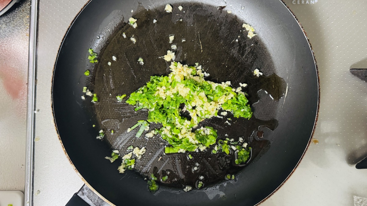 胡麻油を入れて、青葱、生姜、ニンニクを炒める。2、3分くらい炒める。